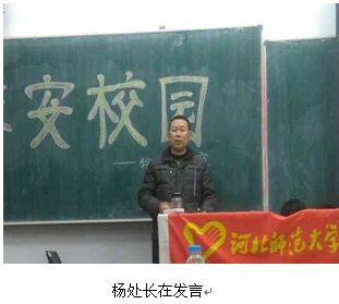 2015年12月20日晚7点,由物理科学与信息工程学院青年志愿者协会策划的“平安校园”活动在公教楼如期举行。此次活动我们邀请到了保卫处的杨处长和女子防身术的授课老师李伟老师作为活动嘉宾。