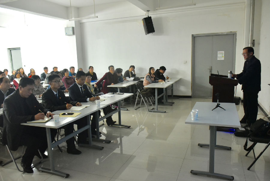 朱月龙教授从党的十九大报告的主题为切入点,在报告产生的强烈反响、重要论述、重大战略要求等三个层面解读了十九大报告精神。重点对中国特色社会主义的新时代、新阶段、新思想、新战略四个“新”谈了自己的深刻认识和理解。他强调:习近平新时代中国特色社会主义思想是十九大精神的主线和灵魂,我们必须始终坚持以这一科学理论统一思想和行动,将其贯穿到社会主义现代化建设全过程,体现到党的建设各方面;要牢固树立“四个意识”,坚定“四个自信”,积极投身到新时代中国特色社会主义伟大实践中去,为实现伟大中国梦展现新作为。朱月龙教授从理论和实践两个层面引用了丰富的实例、大量的图片、精确的数字,深入浅出,对十九大报告精神进行了详细的解读,发人深省,使全体师生党员对十九大报告精神有了更加深刻的理解。