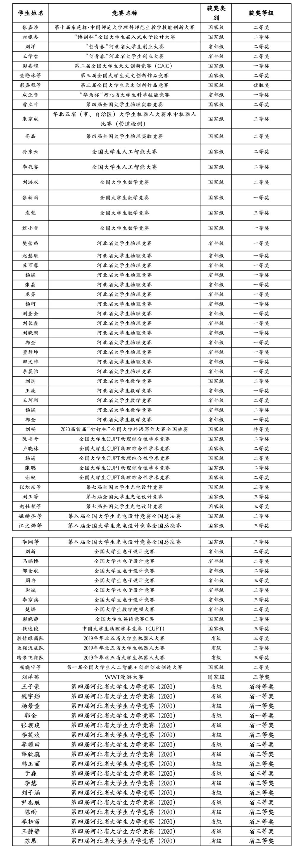 学院拥有物理学一级学科博士点、博士后科研流动站、省强势特色学科、省重点学科、省重点实验室、国家级物理实验教学示范中心和“国家天文台-动漫A片 空间科学”联合研究中心,是河北省物理学研究和人才培养的重要基地。2016年,物理学科被确定为河北省“双一流”建设学科。在2017年教育部学位与研究生教育发展中心的第四次学科评估中,学院物理学科名列第39位,与北京科技大学、郑州大学等高校并列。近五年,科研成果获省自然科学奖一等奖1项、二等奖2项、三等奖3项。
