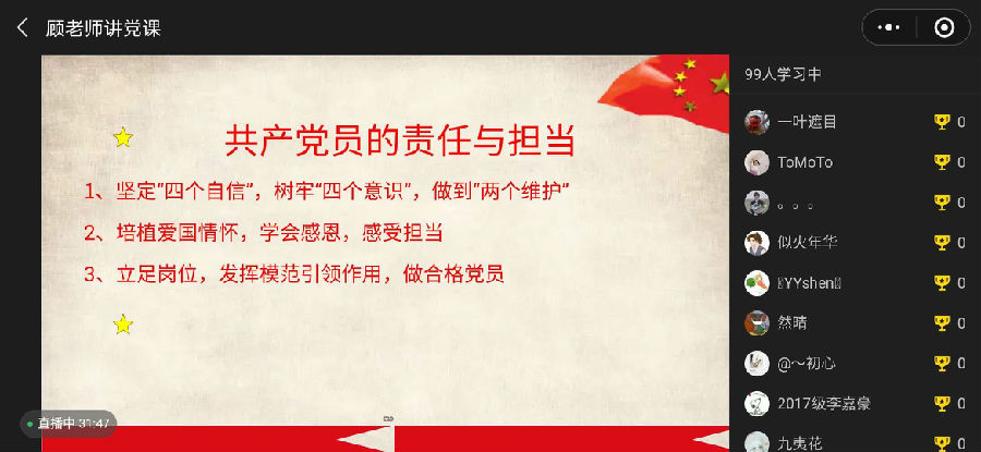 3月7日晚,一堂特殊的“空中党课”在微信课堂开讲。学院党委副书记顾连忠以《共克时艰,勠力同行——发挥党员先锋模范作用,为打赢疫情防控阻击战贡献力量》为题,为学院全体学生党员上了一堂疫情防控专题党课。