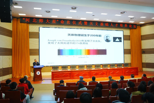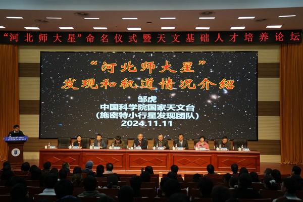 11月11日,“河北师大星”命名仪式在学校会议中心报告厅举行。中国科学院国家天文台台长刘继峰,中国天文学会理事长、中国科学院院士、云南天文台研究员韩占文,中国科学院院士、国家天文台研究员赵刚,国家天文台教育处处长梁艳春,国家天文台研究员邹虎,中国科学院高能物理研究所研究员王建民,中国科学院上海天文台研究员路如森出席。校党委副书记、校长刘敬泽致辞。党委常委、副校长刘英主持。中国科学院国家天文台相关工作人员,学校相关单位主要负责人和师生代表200余人参加命名仪式。