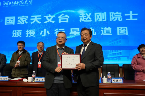 刘继峰在仪式上宣读“河北师大星”国际命名公报和命名证书,并向我校颁送命名公报和证书;赵刚向我校颁送“河北师大星”轨道图。邹虎介绍“河北师大星”的发现过程,并展示小行星相关参数和运行轨迹图。